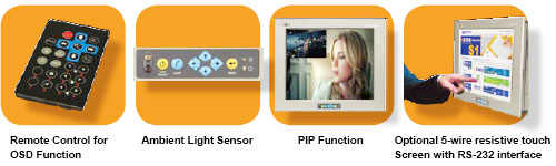 OSD functions are accessed via a water proof keys on the front panel. Front panel OSD functions simplify system configuration. The remote control that comes with the monitor is equipped with its own OSD functions that allows users to configure the monitor from remote locations.