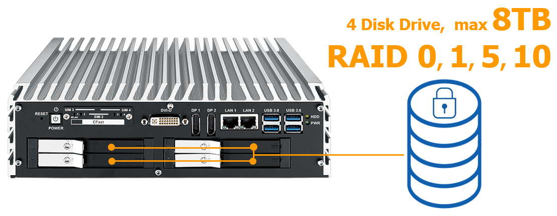 Quad Core 6th Generation Intel® Xeon®/ Core™ i7/ i5/ i3 (Skylake-H) In-Vehicle Fanless Embedded System with Intel® CM236, 2 GigE LAN, 4 Front-access SSD Tray, Isolated DIO, High Performance, Rugged, Extended Temperature |