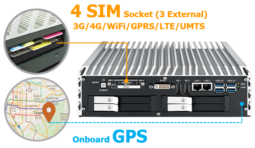 4 Mini PCIe, 4 SIM Card Socket (3 External) |